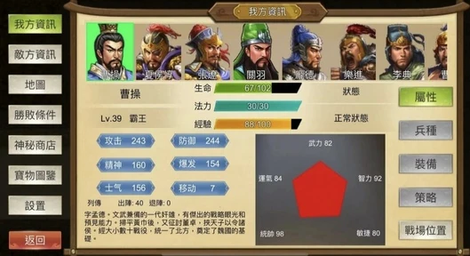 三国霸王大陆(中文辅助菜单)是一款以汉末三国时期为背景的策略角色扮演游戏,玩家将在游戏中体验曹操从镇压黄巾军动乱开始,奋力征战群雄,逐步统一天下的跌宕历程。游戏高度还原三国历史,各种历史名将悉数登场,玩家将亲历董卓之乱、讨伐吕布、剿灭袁术、官渡之战、赤壁鏖兵、汉中争夺等一系列关键战役,跌宕起伏的剧情呈现出一幅波澜壮阔的三国画卷。